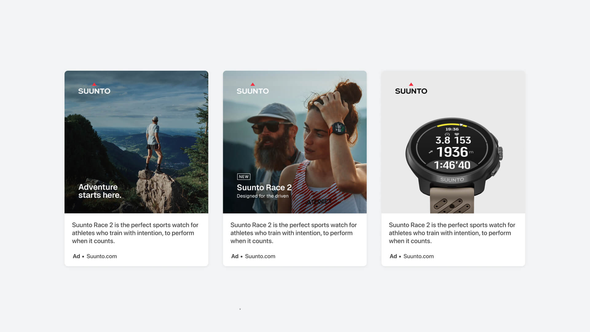 Suunto ads should inspire action and curiosity while staying true to our tone. Use creative hooks to grab attention, spark interest in the moment, and leave a lasting impression. Always include a clear call to action (CTA) that tells the audience what to think, feel, or do next.